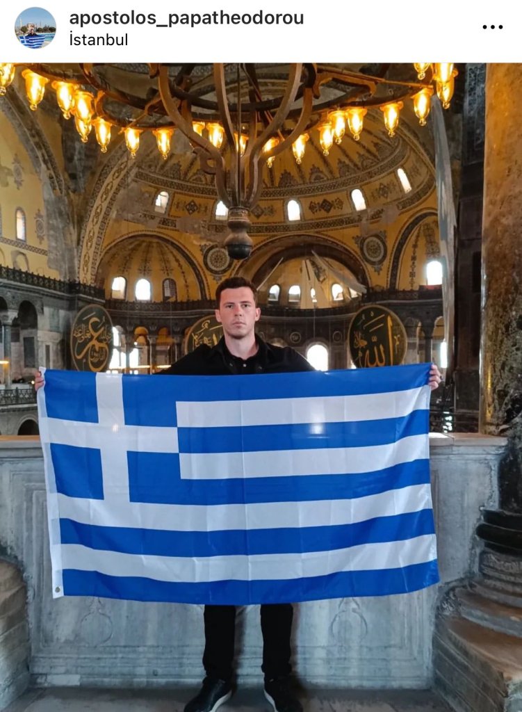Αντιδράσεις προκάλεσε στην Τουρκία η κίνηση του Έλληνα τουρίστα Απόστολου Παπαθεοδώρου να φωτογραφηθεί μέσα στην Αγία Σοφία κρατώντας στα χέρια του την ελληνική σημαία.