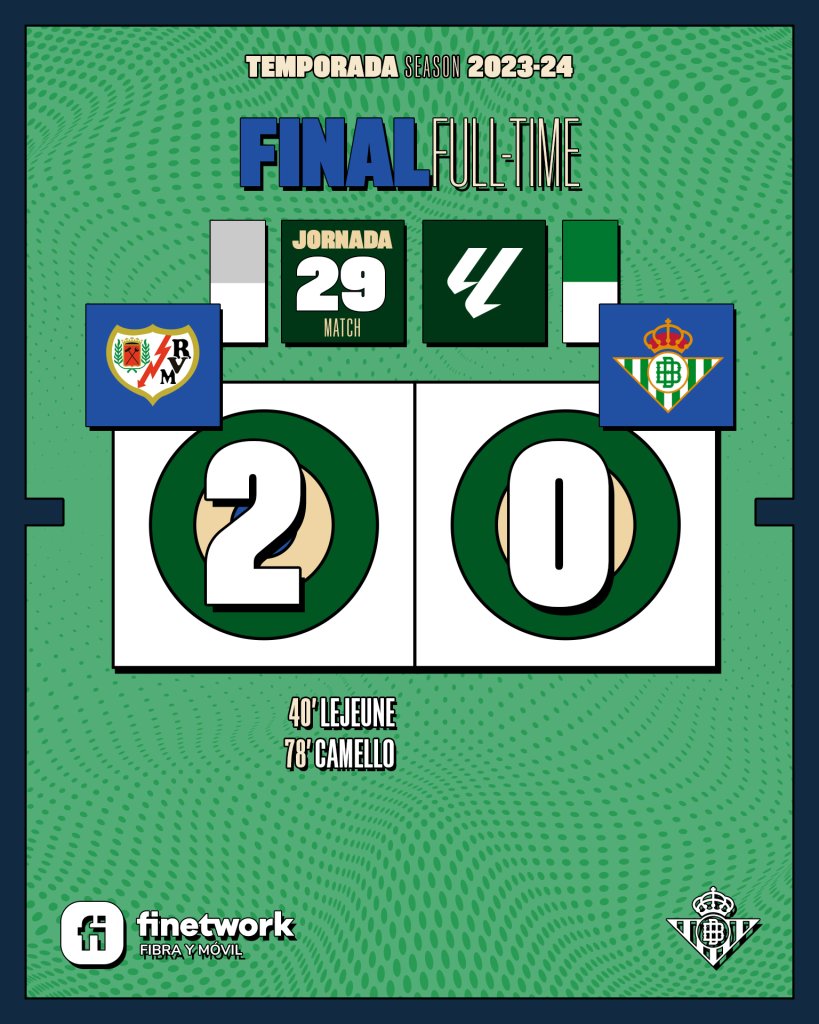 Νέα γκέλα για την Μπέτις, η οποία βλέπει την Ευρώπη να απομακρύνεται. Οι «βερδιμπλάνκος» ηττήθηκαν με 2-0 από την Ράγιο Βαγιεκάνο στο «Βαγιέκας» για την 29η αγωνιστική της La Liga, έμειναν για τρίτο σερί ματς δίχως τρίποντο και έχασαν και άλλο έδαφος στη «μάχη» ενός ευρωπαϊκού εισιτηρίου. Νίκη μετά από σχεδόν τέσσερις μήνες για τους γηπεδούχους, οι οποίοι απομακρύνθηκαν από την επικίνδυνη ζώνη.