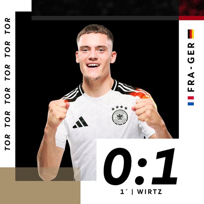 Λίγο μετά το γκολ της Αυστρίας στο 6ο δευτερόλεπτο, η Γερμανία ανοίγει το σκορ στην Γαλλία με τρομερό γκολ του Φλόριαν Βιρτς στο… 7ο δευτερόλεπτο! Ο Κρόος έδωσε την μπάλα στον μεσοεπιθετικό της Λεβερκούζεν, ο οποίος εξαπέλυσε βολίδα εκτός περιοχής. Η μπάλα βρήκε στην πλάτη του Ουπαμεκανό αλλάζοντας ελαφρώς πορεία, χτύπησε στο οριζόντιο δοκάρι και κατέληξε στα δίχτυα του Σαμπά για το 0-1.