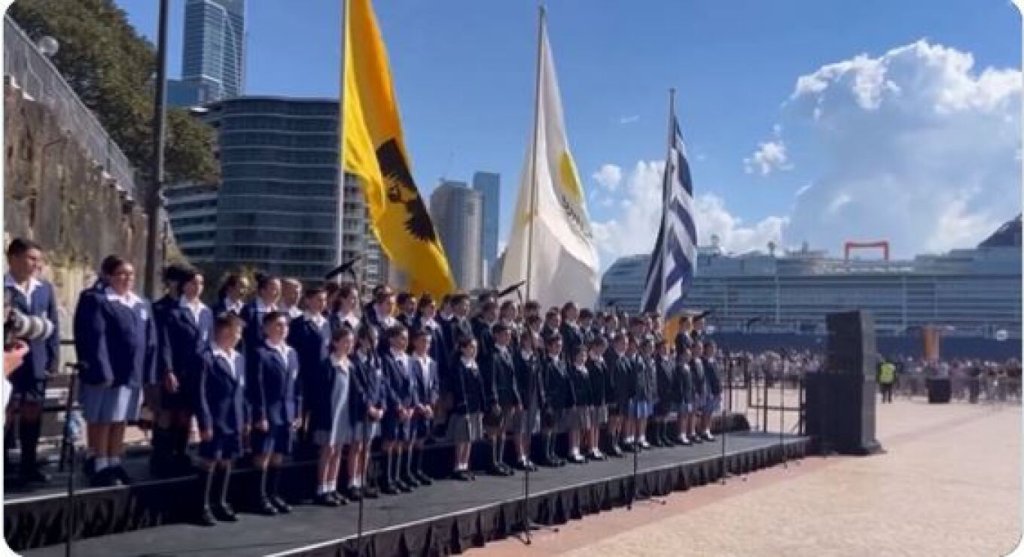 Στην Αυστραλία οι ομογενείς τραγουδούν τον εθνικό ύμνο στην Όπερα του Σίδνεϊ.