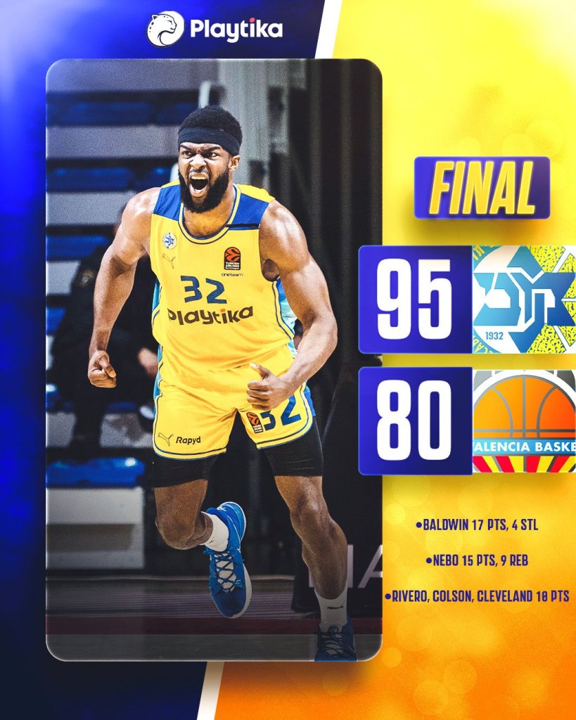 Άνετη νίκη πέτυχε η Μακάμπι κόντρα στη Βαλένθια με 95-80 κι ελπίζει ακόμη στην είσοδό της στην πρώτη εξάδα.