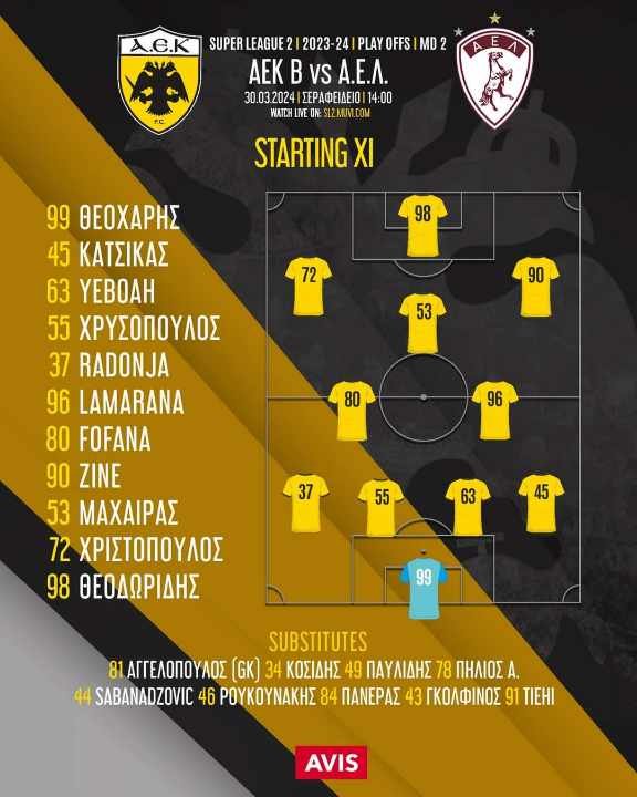 ΑΕΚ Β’ (Νίκος Κούστας): Θεοχάρης, Κάτσικας, Γιεμπόα, Χρυσόπουλος, Ραντόνια, Λαμαρανά, Φοφανά, Ζίνι, Μαχαίρας, Χριστόπουλος, Θεοδωρίδης