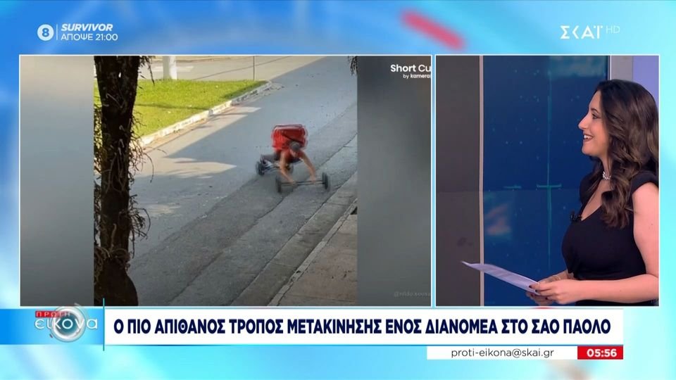 Ντελιβεράς στο Σάο Πάολο μεταφέρει με πατίνι ισορροπίας στα πόδια και ρόδες στα χέρια τις παραγγελίες του