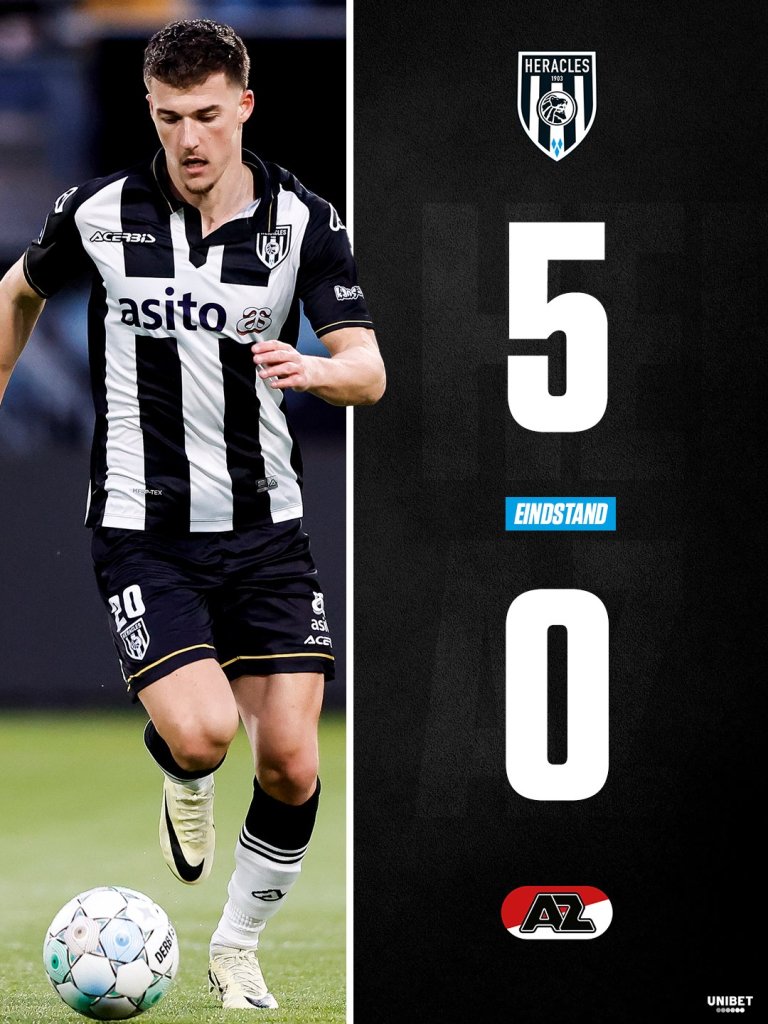 Η Χέρακλες άνοιξε το σκορ στο 19ο λεπτό με τον Ντε Κεϊρσμέκερ και στο 38’ ο Χόρνκαμπ έκανε το 2-0 με πέναλτι ενώ στο 40’ ο ίδιος με νέο πέναλτι διαμόρφωσε το 3-0.Στο 90ο λεπτό ο Σανκό έκανε το 4-0 και ο ίδιος διαμόρφωσε και το 5-0 στο 90+4’.
