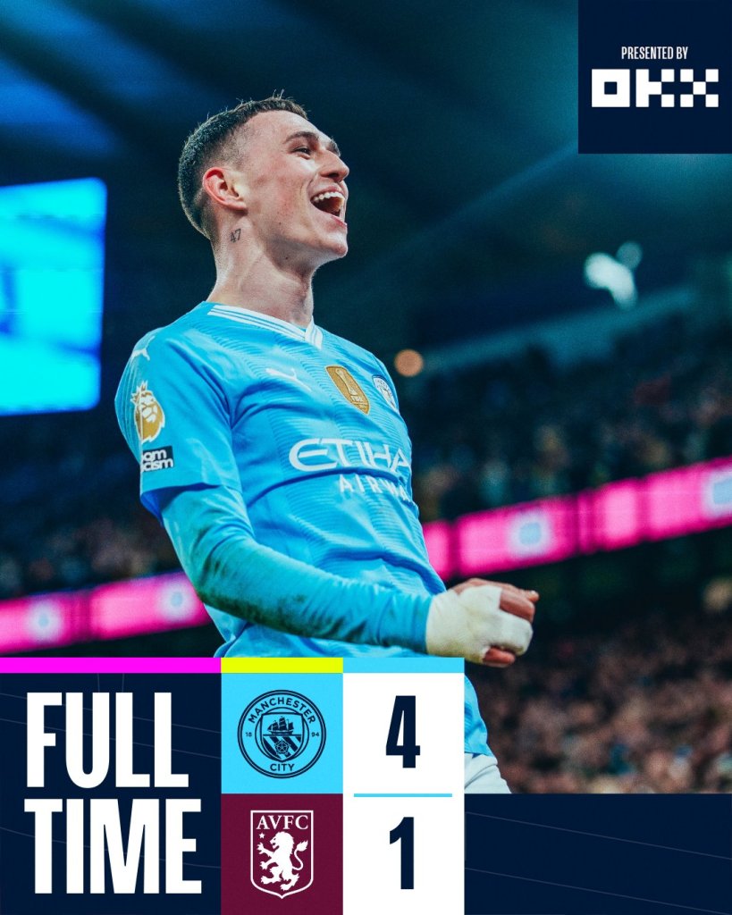 Πάρτι έστησε η Σίτι κόντρα στη Βίλα, την οποία διέλυσε με 4-1 και πήρε εκδίκηση για την ήττα με 1-0 στον πρώτο γύρο. Στη 2η θέση η Σίτι μαζί με τη Λίβερπουλ που έχει όμως ένα ματς λιγότερο. Σόου του Φιλ Φόντεν που πέτυχε χατ τρικ ενώ ξεκουράστηκαν οι Ντε Μπρόινε και Χάαλντ. στον αντίποδα η Βίλα βρίσκεται πλέον στο +2 από την Τότεναμ και με ματς παραπάνω και ίσως βρεθεί εκτός τετράδας.