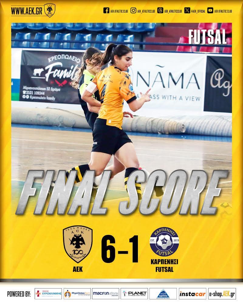 Η γυναικεία ομάδα Futsal της ΑΕΚ πήρε τη νίκη εντός έδρας, με 6-1 απέναντι στο Καρπενήσι, σε έναν αγώνα που διεξήχθη στην Παλλήνη και έτσι πέρασε στο Final-4 του πρωταθλήματος, σε συνδυασμό και με το πρώτο ματς, όπου είχε κερδίσει ξανά, με σκορ 7-1.
