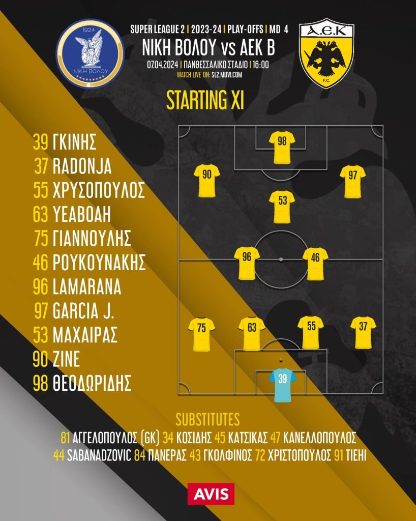 ΑΕΚ Β’ (Νίκος Κούστας): Γκίνης, Ραντόνια, Γιεμπόα, Χρυσόπουλος, Γιαννούλης, Λαμαρανά, Ρουκουνάκης, Ζίνι, Μαχαίρας, Τζ. Γκαρσία, Θεοδωρίδης