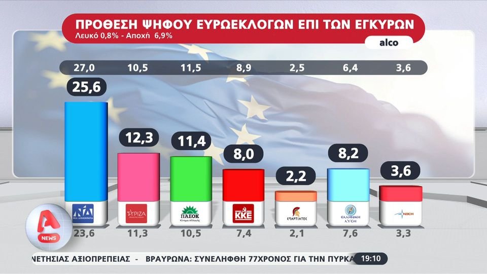 Ισχυρό προβάδισμα με απώλειες, διατηρεί η ΝΔ έναντι του δεύτερου ΣΥΡΙΖΑ στη δημοσκόπηση της ALCO που παρουσιάστηκε στο κεντρικό δελτίο του Alpha, προσεγγίζοντας τα ποσοστά των ευρωεκλογών του 2019, αφού η εταιρεία εκτιμά σε αυτή τη συγκυρία το ποσοστό της από το 29% ως το 33%. Το ΠΑΣΟΚ, που παραμένει σταθερό στην πρόθεση ψήφου επί των εγκύρων, είναι στην τρίτη θέση και σε αυτή τη μέτρηση, με άνω όριο το 14%, τη στιγμή ο ΣΥΡΙΖΑ φτάνει ως και στο 16%.
