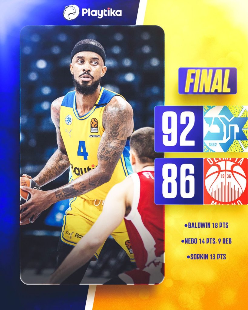Σε ένα παιχνίδι με φοβερό ρυθμό η Μακάμπι λύγισε την Αρμάνι (92-86) σημειώνοντας την 20η νίκη της στην διοργάνωση. Πολύ καλή εμφάνιση από τον Μπόλντγουιν με 18 πόντους.