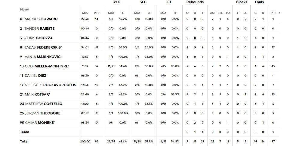 Το καλύτερό του φετινό ματς έκανε ο Λορέντζο Μπράουν (29 πόντοι με 7/8 τρίποντα, 5 ασίςτ και 5 ριμπάουντ) ενώ τον ακολούθησαν Μπάλντγουϊν (26 πόντοι), Νίμπο, Κόλσον και Μπλατ. Μόνος του πάλευε για την Μπασκόνια ο ΜακΙντάιρ που πέτυχε 32 πόντους και είχε 45 στο σύστημα αξιολόγησης!