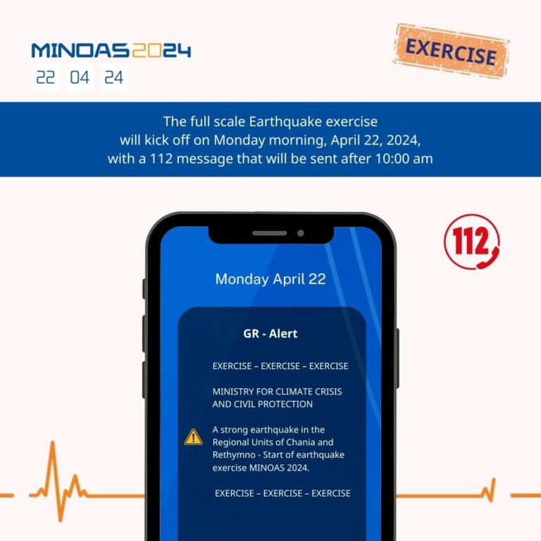 Συγκεκριμένα όπως αναφέρεται: «Το υπουργείο Κλιματικής Κρίσης και Πολιτικής Προστασίας ανακοινώνει ότι στο πλαίσιο διεξαγωγής της Επιχειρησιακής Άσκησης Πεδίου Πλήρους Ανάπτυξης Σεισμού και Συνοδών Γεωδυναμικών Φαινομένων στην Περιφέρεια Κρήτης με την κωδική ονομασία «ΜΙΝΩΑΣ 2024», που θα πραγματοποιηθεί στο νησί στις 22, 23 και 24 Απριλίου, θα γίνει χρήση του εξερχόμενου σκέλους της Υπηρεσίας του Ευρωπαϊκού Αριθμού Έκτακτης Ανάγκης 112 (αποστολή μηνυμάτων)».