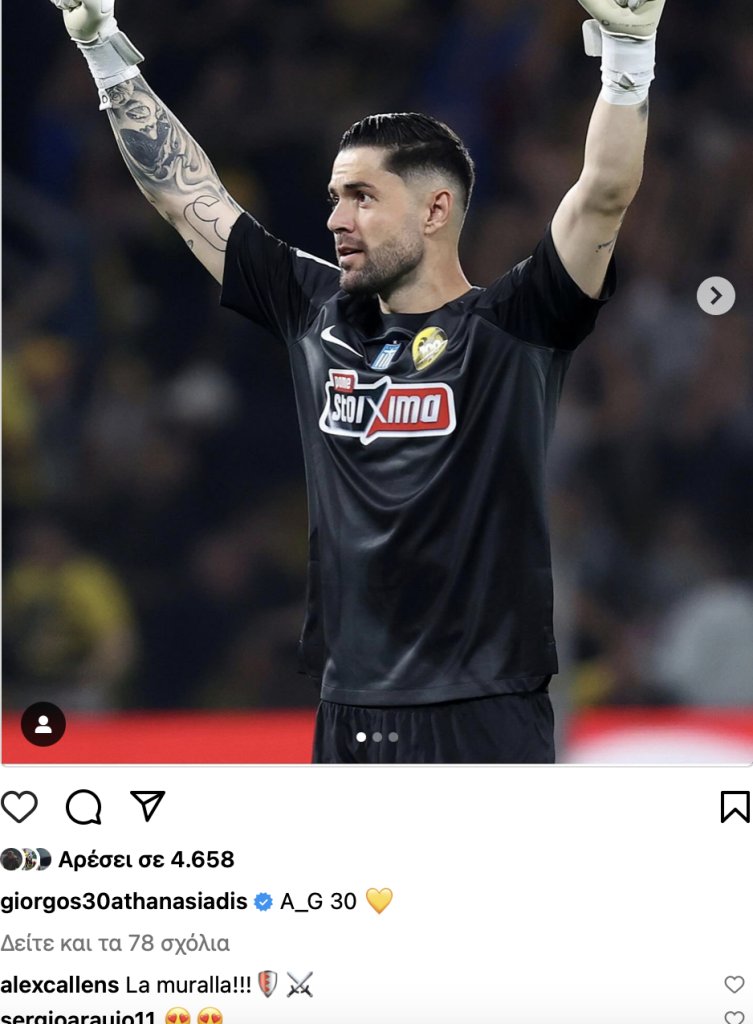 Ο Γιώργος Αθανασιάδης μπορεί χθες να είχε ένα… ήσυχο ντέρμπι ωστόσο βρίσκεται σε εξαιρετική κατάσταση και έχει αποδειχτεί κομβικός σε προηγούμενα ντέρμπι όπως σε αυτό με τον Ολυμπιακό. Ο γκολκίπερ της ΑΕΚ λοιπόν μετά τον θρίαμβο επι του ΠΑΟ ανέβασε σχετικό ποστ και από κάτω υπήρξαν πάρα πολλά αποθεωτικά σχόλια. Ένα εξ αυτών, του Αλεξάντερ Κάλενς, ο οποίος τον αποκάλεσε «το τείχος»!