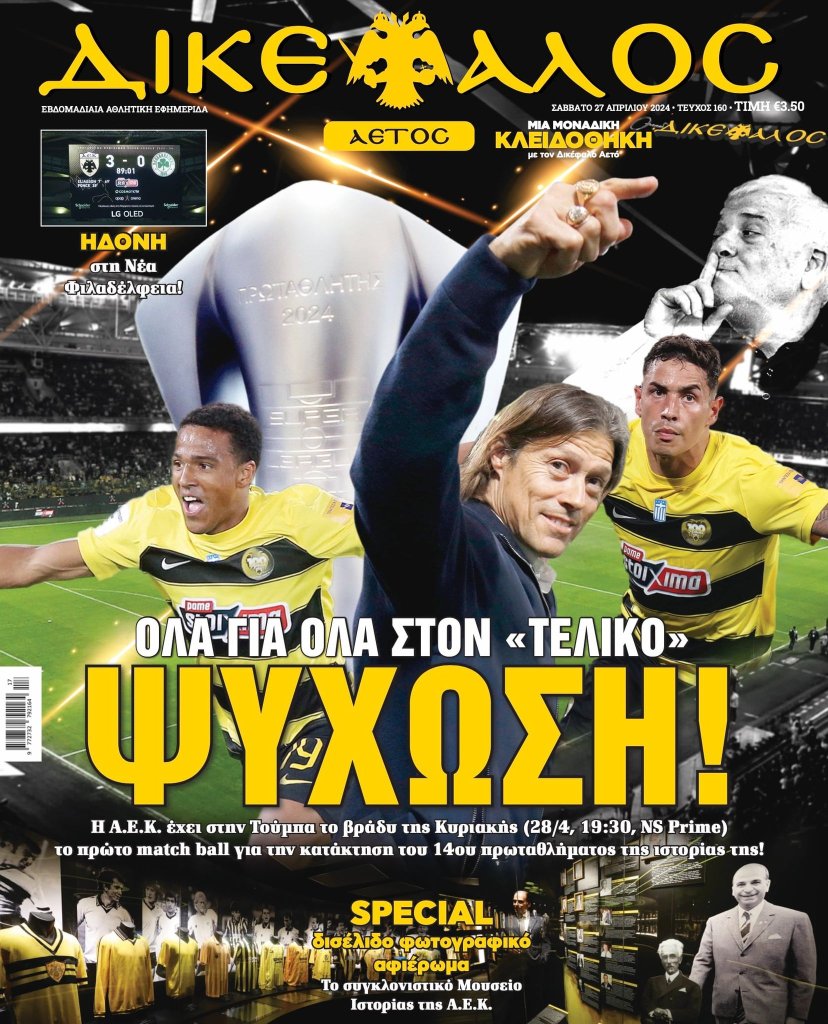 Διαβάστε επίσης: Αποκλειστικά ρεπορτάζ, θέματα και αναλύσεις, αρθρογραφία από τους καλύτερους ρεπόρτερ της Α.Ε.Κ., πλούσια παρασκήνια και μάθετε τα πάντα, για όλα τα αθλήματα του «κιτρινόμαυρου» πλανήτη. Και όπως πάντα ένα απολαυστικό δισέλιδο από τον μυθικό Φ.Κ.
