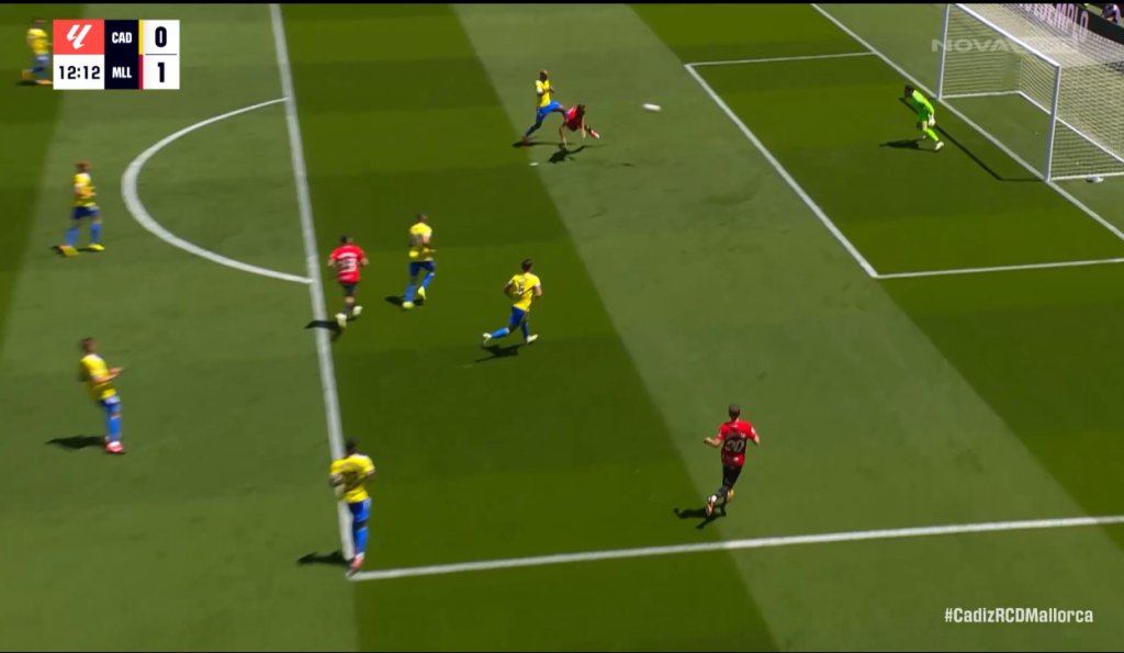Στο 12ο λεπτό, ο Βαλιέντ, από τα δεξιά, έβγαλε τη σέντρα και ο Μουρίκι, με κεφαλιά, έβαλε μπροστά στο σκορ τη Μαγιόρκα, με τον Κοσοβάρο να φτάνει τα έξι γκολ, στη φετινή σεζόν, όντας ο πρώτος σκόρερ της ομάδας του. Επτά λεπτά αργότερα, η Μαγιόρκα είχε νέα τελική, με καλό σουτ του Γκονζάλες, αλλά, την μπάλα να περνάει πάνω από τα δοκάρια. Η πιο σημαντική φάση της Κάδιθ, στο πρώτο μέρος, ήταν το ψαλίδι του Ράμος, στις καθυστερήσεις του ημιχρόνου, με τον γκολκίπερ Ραΐκοβιτς να μπλοκάρει την μπάλα.