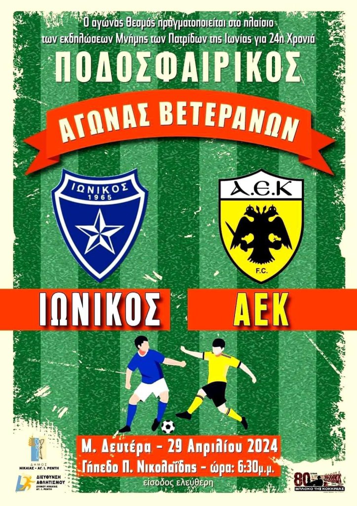 Τον καθιερώμενο πασχαλιάτικο φιλικό αγώνα θα δώσουν τη Μεγάλη Δευτέρα 29/04 οι Παλαίμαχοι του Ιωνικού και της ΑΕΚ στο γήπεδο Παντελής Νικολαΐδης στις 18.30.