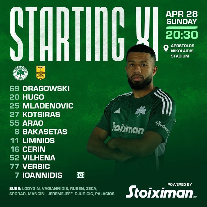 Στα δύο άκρα της άμυνας οι Μλαντένοβιτς και Κώτσιρας, με τον Ντραγκόφσκι στο τέρμα, ενώ στην κορυφή της επίθεσης θα βρίσκεται ξανά ο Ιωαννίδης, με τον Βέρμπιτς στο δεξί άκρο (ο Λημνιός στο άλλο).