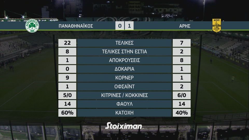 Ο Άρης έφυγε νικητής, 1-0, από τη Λεωφόρο και πέταξε εκτός διεκδίκησης του πρωταθλήματος τον Παναθηναϊκό. Οι γηπεδούχοι βρέθηκαν πίσω στο σκορ από τα... αποδυτήρια, με κεφαλιά του Ζαμόρα στο δεύτερο λεπτό, και, στη συνέχεια, προσπάθησαν, με σωστό ή και ανορθόδοξο τρόπο, να φτιάξουν φάσεις, να απειλήσουν τον Κουέστα, βρέθηκαν να παίζουν με δυο δεκάρια και τρεις επιθετικούς, αλλά δεν κατάφεραν να σκοράρουν με αποτέλεσμα τις έντονες αποδοκιμασίες στο τέλος της αναμέτρησης προς τους παίκτες αλλά και τον Φατίχ Τερίμ.