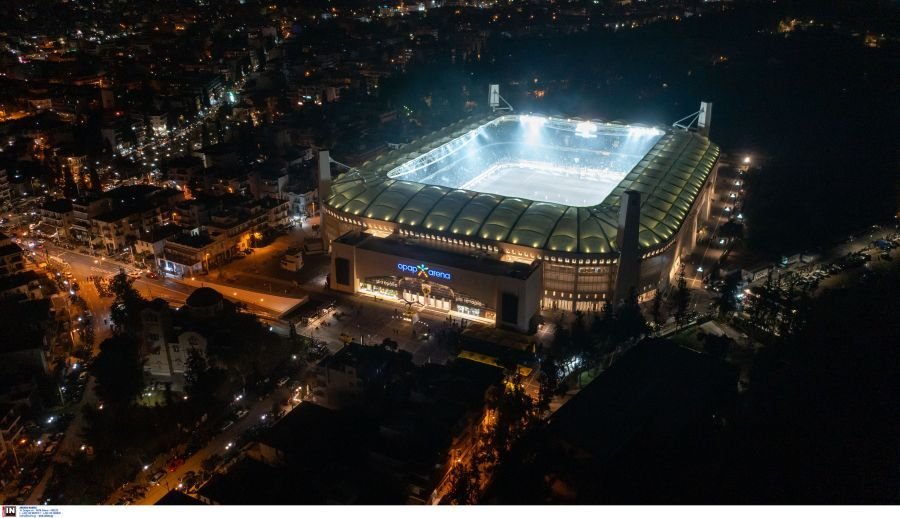 Φορτούνης (Ολυμπιακός), Ουότκινς (Άστον Βίλα), Νίκο Γκονζάλες (Φιορεντίνα) και Τιάγκο (Μπριζ) κοιτούν το γήπεδο της ΑΕΚ, ενώ στον ορίζοντα φαίνεται και η Ακρόπολη.