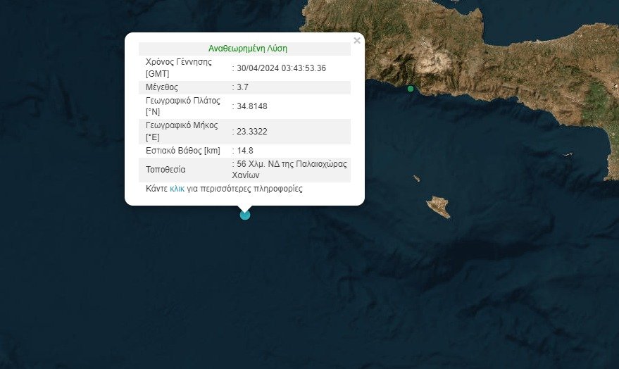 Σύμφωνα με το Γεωδυναμικό Ινστιτούτο, η μία σεισμική δόνηση καταγράφηκε λίγο πριν τις 6 το πρωί στα Χανιά και συγκεκριμένα στα ανοιχτά της Παλαιόχωρας. Είχε μέγεθος 3,7 Ρίχτερ, εστιακό βάθος 14,8 χλμ και σημειώθηκε 56χλμ ΝΔ της Παλαιόχωρας.