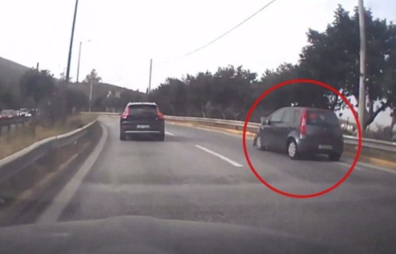 Για περισσότερο από ένα λεπτό συνεχόμενα, το ΙΧ ακουμπάει στο πεζοδρόμιο και οι ζάντες του καταστρέφονται. Ο κίνδυνος για ένα σοβαρότατο ατύχημα στο σημείο είναι διαρκής και κάνει ορισμένους από τους οδηγούς που ακολουθούν να κρατούν απόσταση ασφαλείας.