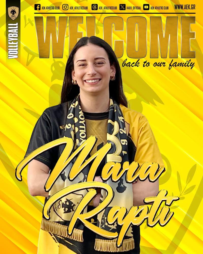 Η Μάρα Ράπτη επέστρεψε στη γυναικεία ομάδα βόλεϊ της ΑΕΚ ύστερα από τρία χρόνια, αφού ανακοινώθηκε επίσημα η απόκτηση της 27χρονης ακραίας, που αγωνιζόταν στον Απολλώνιο Κερατσινίου τα τελευταία δύο χρόνια. Η επίσημη ενημέρωση της Ερασιτεχνικής ΑΕΚ έχει ως ακολούθως: «Η ΑΕΚ βρίσκεται στην ευχάριστη θέση να ανακοινώσει την έναρξη της συνεργασίας της με την Μάρα Ράπτη. Η 27χρονη (30/10/1996) ακραία, ύψους 1,77 μ., υπέγραψε το συμβόλαιό της και επιστρέφει στη γυναικεία ομάδα Βόλεϊ του Συλλόγου, ύστερα από τρία χρόνια.