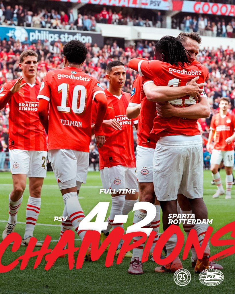 Με μέταλλο πρωταθλήτριας η Αϊντχόφεν καθάρισε με ανατροπή την Σπάρτα (4-2) και κατέκτησε το 25ο πρωτάθλημά της στην Ολλανδία. Έσπασε τα κοντέρ φέτος η επίθεση της ομάδας του Πίτερ Μπος, 107 γκολ σε 32 παιχνίδια.