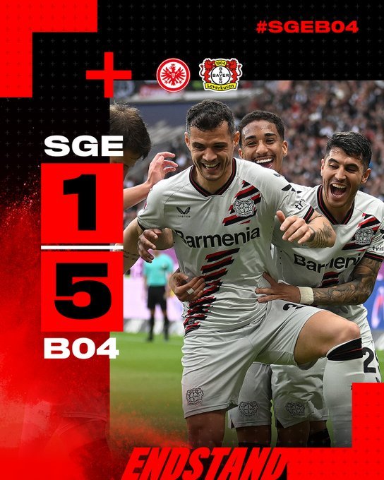 Η Μπάγερ Λεβερκούζεν πέρασε με το εμφατικό 5-1 από την έδρα της Άιντραχτ Φρανκφούρτης και χρειάζεται ακόμα δύο ματς χωρίς ήττα για να γίνει η πρώτη ομάδα στην ιστορία της Bundesliga που θα κατακτήσει τον τίτλο αήττητη! Επιπλέον, η νίκη αυτή κράτησε για 48ο παιχνίδι χωρίς ήττα την Λεβερκούζεν, ισοφαρίζοντας την καλύτερη μεταπολεμική επίδοση στην Ευρώπη που ανήκει στην Μπενφίκα. Πλέον κυνηγάει τα 60 παιχνίδια της Ουνιόν Σεν-Ζιλουάζ από το 1935 και τα 62 της Σέλτικ από το 1917 που αποτελούν το ρεκόρ.