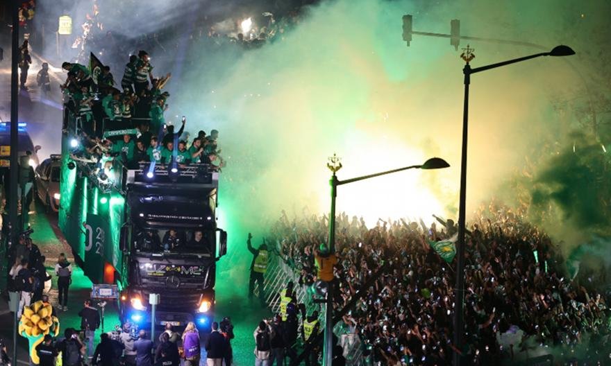 Έξαλλοι πανηγυρισμοί στη Λισαβόνα για την κατάκτηση του τίτλου από την Σπόρτινγκ! Χιλιάδες φίλοι των πρωταθλητών έδωσαν «βροντερό παρών» σε κεντρικούς δρόμους της πορτογαλικής πρωτεύουσας, αποθεώνοντας τους πρωταθλητές και δημιουργώντας εντυπωσιακή ατμόσφαιρα, με δυνατά συνθήματα πυροτεχνήματα και καπνογόνα!