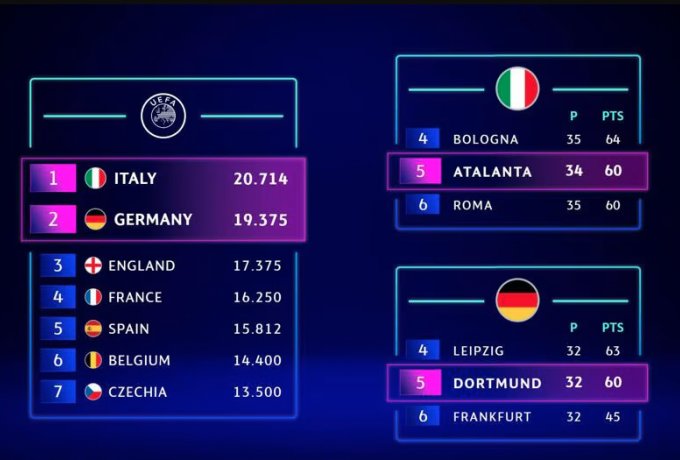 Η Ιταλία και η Γερμανία κράτησαν την διαφορά που είχαν αποκτήσει από την Αγγλία και χάρη στην φετινή απόδοση των συλλόγων τους, βγάζουν και 5ο εκπρόσωπο μέσω του πρωταθλήματος στο επόμενο Champions League.