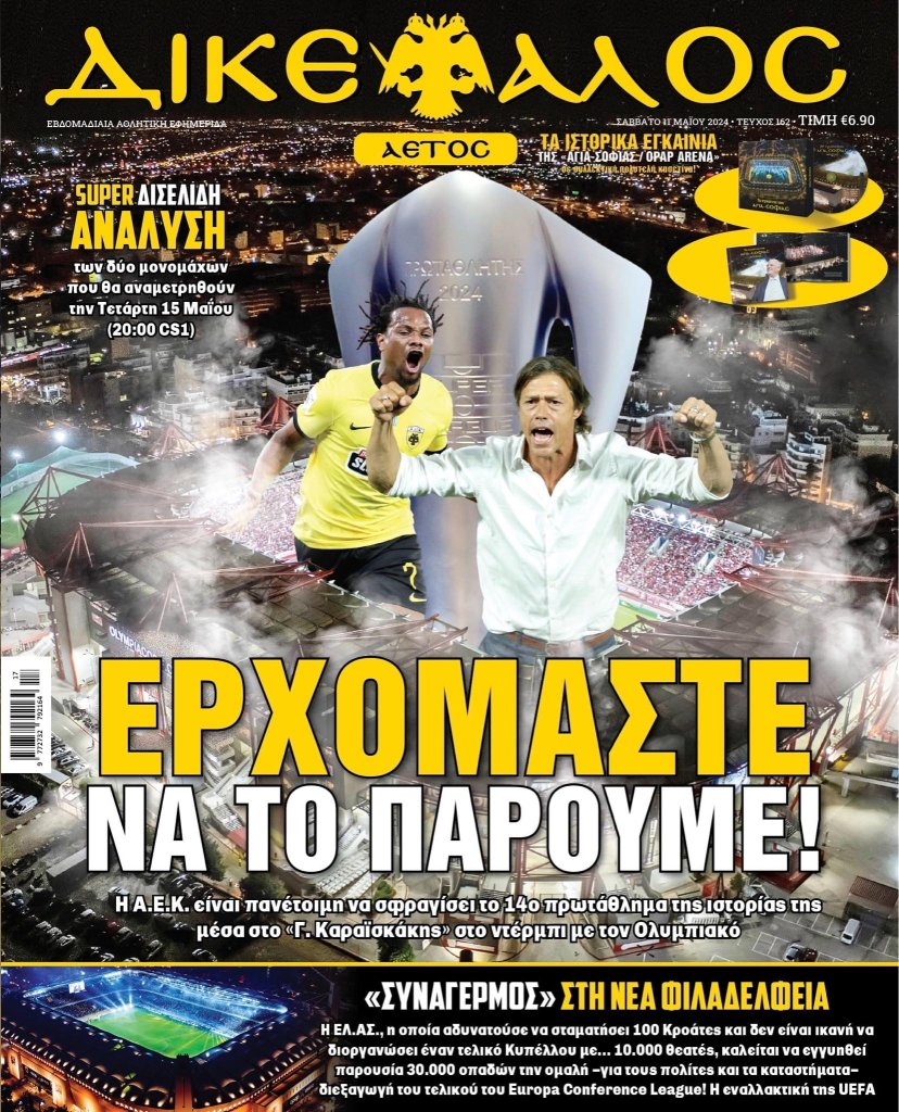 Διαβάστε επίσης: Αποκλειστικά ρεπορτάζ, θέματα και αναλύσεις, αρθρογραφία από τους καλύτερους ρεπόρτερ της Α.Ε.Κ., πλούσια παρασκήνια και μάθετε τα πάντα, για όλα τα αθλήματα του «κιτρινόμαυρου» πλανήτη. Και όπως πάντα ένα απολαυστικό δισέλιδο από τον μυθικό Φ.Κ.