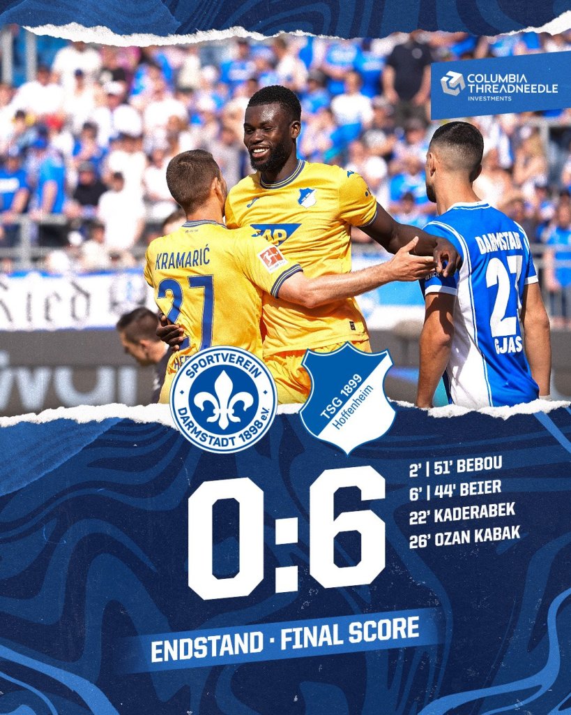 Με πέντε γκολ στο πρώτο ημίχρονο, η Χόφενχαϊμ ήταν σαρωτική, στην έδρα της υποβιβασμένης Ντάρμσταντ, και, με το τελικό 6-0, ανέβηκε στην έβδομη θέση και βρίσκεται μια ανάσα από τη συμμετοχή της στο Conference League, μια αγωνιστική πριν το φινάλε της Bundesliga.