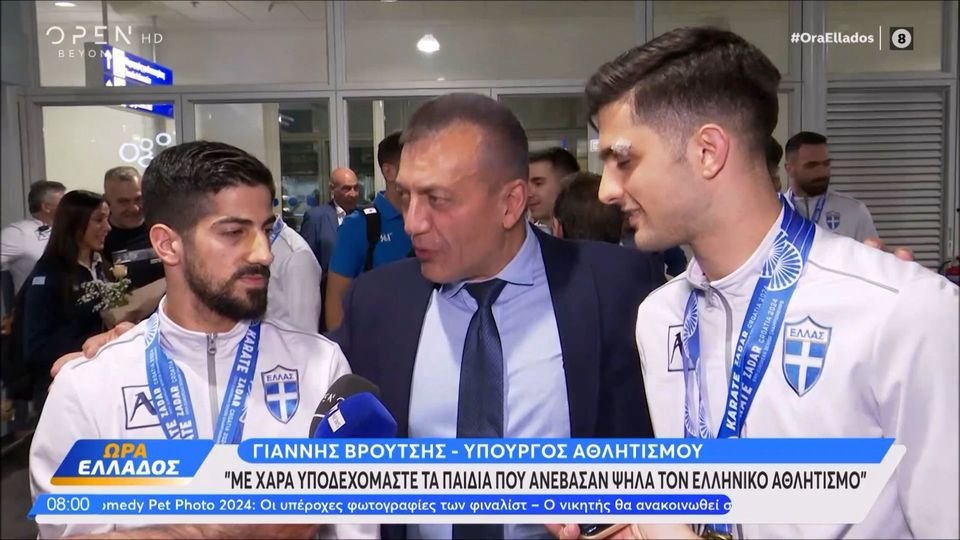 Η ελληνική αποστολή του καράτε έτυχε θριαμβευτικής υποδοχής χθες κατά την άφιξη της στο Ελευθέριος Βενιζέλος με τον υπουργό αθλητισμού Γιάννη Βρούτση να βρίσκεται στο αεροδρόμιο μαζί με φίλους και συγγενείς τους που δημιούργησαν αποθεωτική ατμόσφαιρα.