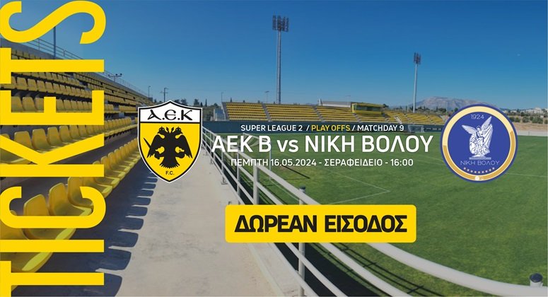 Η ΠΑΕ ΑΕΚ ανακοινώνει ότι η συνάντηση με τη Νίκη Βόλου το απόγευμα της Πέμπτης 16 Μαΐου (16.00) θα διεξαχθεί με ελεύθερη είσοδο. Είναι ο αγώνας της 9ης και προτελευταίας αγωνιστικής των play offs της Super League 2 και οι φίλοι της ΑΕΚ θα έχουν την ευκαιρία να δουν και να χειροκροτήσουν για τελευταία φορά εφέτος την ομάδα μας, η οποία μετά από μια πολύ καλή πορεία εξασφάλισε την είσοδό της στην πρώτη πεντάδα του Α' Ομίλου.