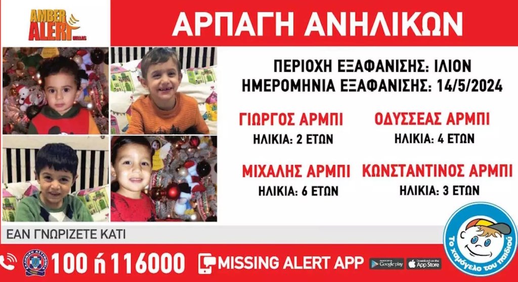 Πρόκειται για τους ανήλικους Μιχάλη Άρμπι, 6 ετών, Οδυσσέα Άρμπι, 4 ετών, Γιώργο Άρμπι, 2 ετών και Κωνσταντίνο Άρμπι, 3 ετών.