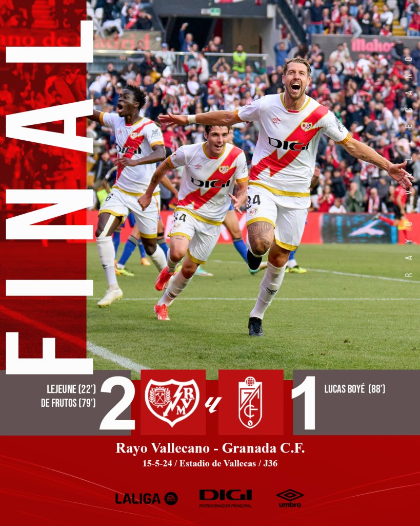 Σε παιχνίδι που ξεκίνησε με κακούς οιωνούς για την Ράγιο καθώς αποβλήθηκε ο Τρέχο στο 5’, οι μαδριλένοι έβγαλαν αντίδραση, κυριάρχησαν και κέρδισαν με 2-1 την Γρανάδα και αν δεν γίνει κάτι συνταρακτικό, σφράγισαν την παραμονή τους στην κατηγορία.