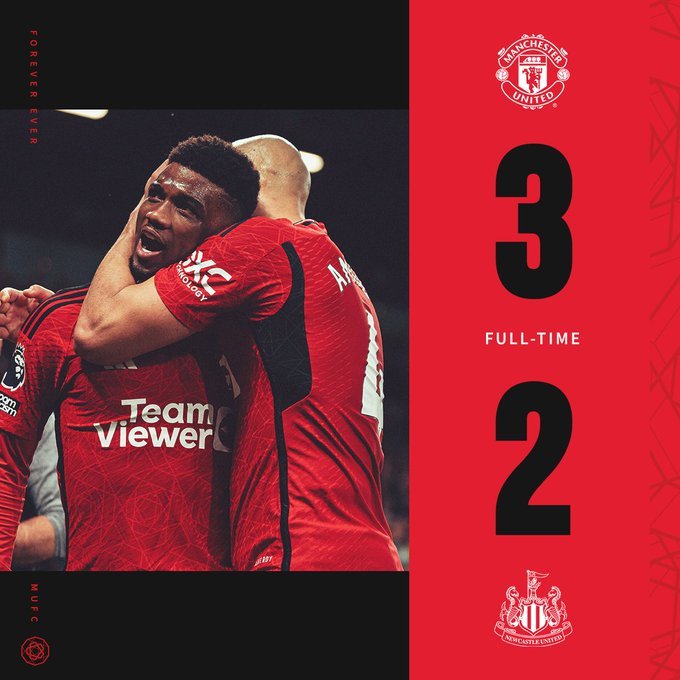 Η Μάντσεστερ Γιουνάιτεντ κέρδισε με 3-2 τη Νιούκαστλ και την έριξε από στην 7η θέση ενώ η ίδια βρίσκεται στην 8η στην ισοβαθμία. Πλέον για να βγει στην Ευρώπη είτε θα πρέπει να πάρει το Κύπελλο είτε να προσπεράσει τη Νιούκαστλ την τελευταία αγωνιστική και τότε ακόμη κι αν χάσει από τη Σίτι στον τελικό, η 7η θέση θα δώσει ευρωπαϊκό εισιτήριο.