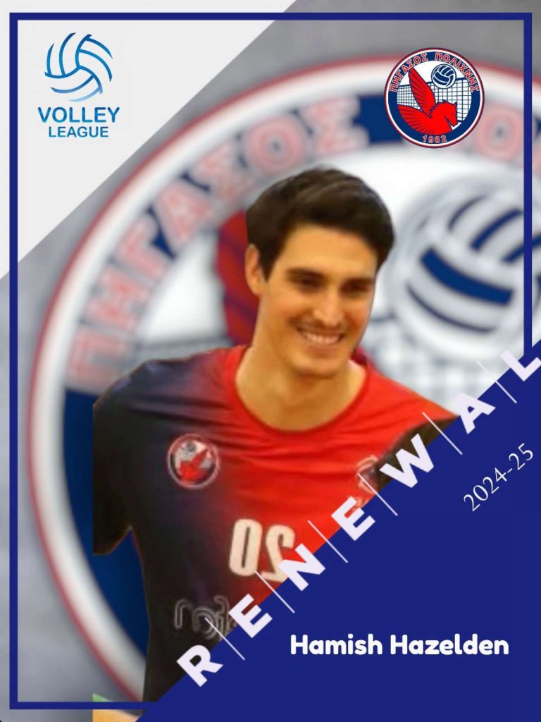 Όπως ανακοίνωσε η διοίκηση του Πήγασου, ο 28χρονος Αυστραλός διαγώνιος, Χαμίς Χάζελντεν, θα συνεχίσει και τη νέα σεζόν να αγωνίζεται στην ανδρική ομάδα βόλεϊ της Πολίχνης. Η επίσημη ανακοίνωση αναφέρει τα παρακάτω: «Το Δ.Σ. του Τ.Α.Α. Πήγασος Πολίχνης με χαρά ανακοινώνει την ανανέωση της συνεργασίας του με τον διαγώνιο Χαμίς Χάζελντεν (Hamish Hazelden).