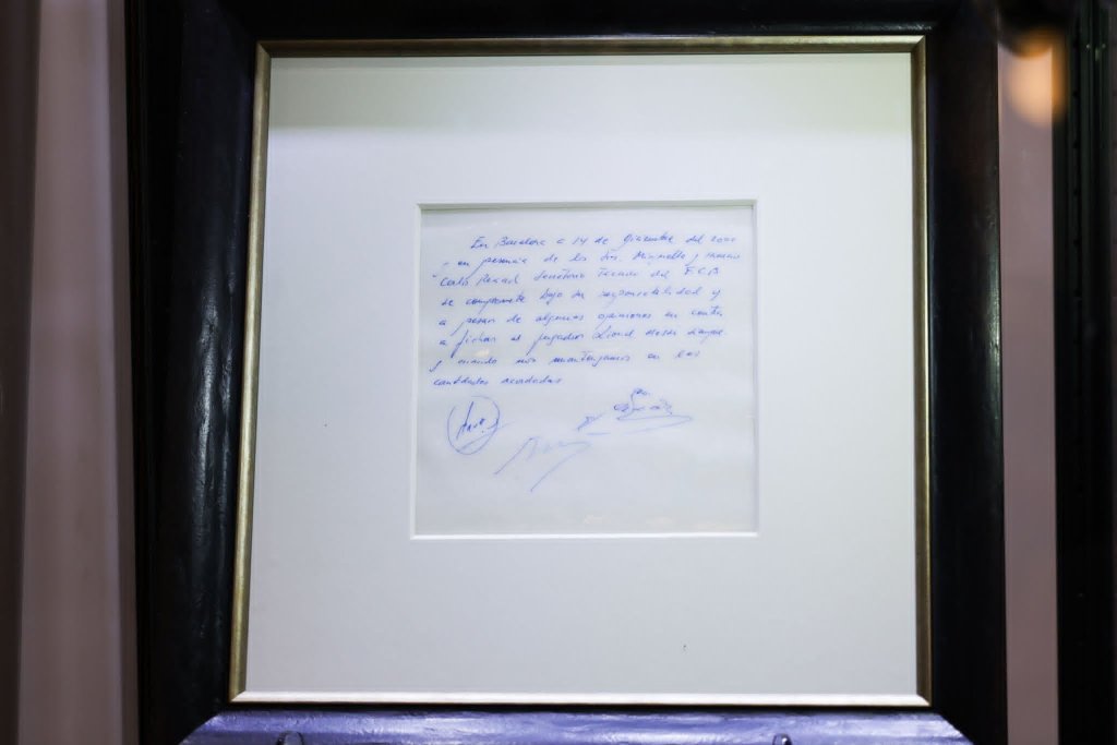 Η χαρτοπετσέτα, με ημερομηνία 14 Δεκεμβρίου 2000, φέρει τις υπογραφές του Γκατζιόλι ενός άλλου ατζέντη, του Χοσέπ Μαρία Μιγνκέλα και του τότε αθλητικού διευθυντή της Barcelona, Κάρλες Ρέσακ που είχαν συναντηθεί σε ένα κλαμπ τένις.