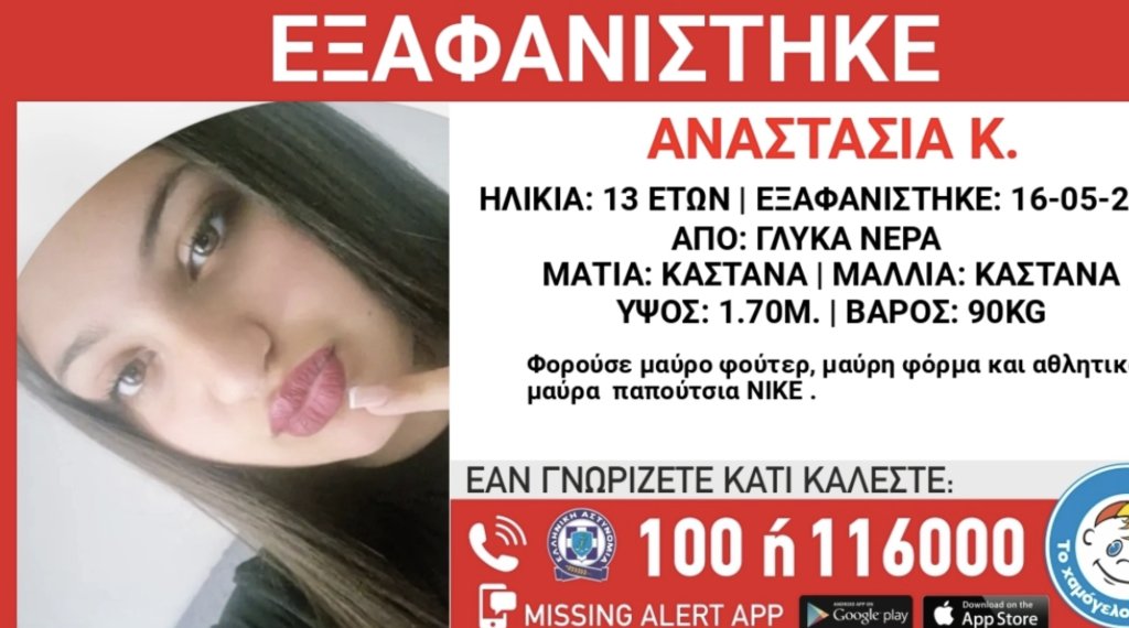Συναγερμός σήμανε στα Γλυκά Νερά για την εξαφάνιση της 13χρονης Αναστασίας Κ., στις 16 Μαΐου 2024, βραδινές ώρες.