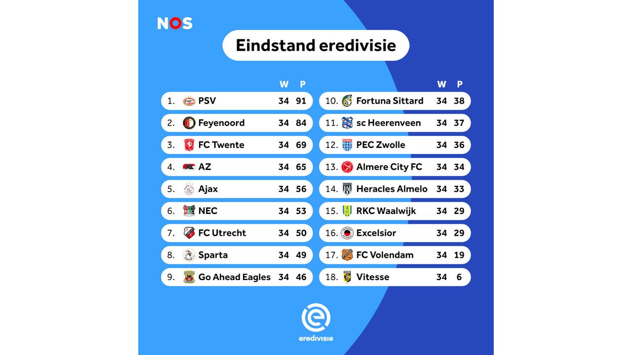 Η τελευταία παρά την ήττα έμεινε στην κατηγορία, υπερτερώντας στην ισοβαθμία της Εξέλσιορ, που την ίδια ώρα γνώριζε τη συντριβή με 4-0 στο γειτονικό ντέρμπι με τη Φέγενορντ. Ο Λάζαρος Λάμπρου έπαιξε βασικός και αντικαταστάθηκε στο ημίχρονο για την ομάδα του Ρότερνταμ, η οποία θα υποχρεωθεί να δώσει μπαράζ παραμονής.