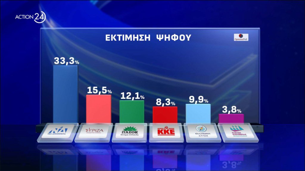 Άνετη επικράτηση της Νέας Δημοκρατίας κατέγραψε η Opinion Poll σε δημοσκόπηση που παρουσιάστηκε στο κεντρικό δελτίο του Action 24. Στην εκτίμηση ψήφου το κυβερνών κόμμα προηγείται με 33,3%. Ακολουθεί ο ΣΥΡΙΖΑ με 15,5 και τρίτο το ΠΑΣΟΚ με 12. Η Ελληνική Λύση είναι στα όρια του διψήφιου (9,9%) και το ΚΚΕ στο 8%. 3,8% για την Πλεύση Ελευθερίας και 3,3% για τη Νίκη. Όλα τα υπόλοιπα κόμματα μετρήθηκαν κάτω από το 3%.