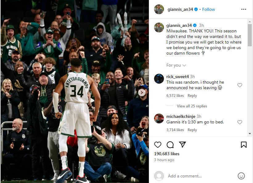 Σε ανάρτηση στο Instagram, ο Γιάννης Αντετοκούνμπο έγραψε: "Μιλγουόκι, ΣΕ ΕΥΧΑΡΙΣΤΩ! Η φετινή σεζόν δεν τελείωσε όπως θα θέλαμε, αλλά υπόσχομαι ότι θα επιστρέψουμε εκεί που ανήκουμε και θα μας δώσουν τα ρημάδια τα λουλούδια μας".