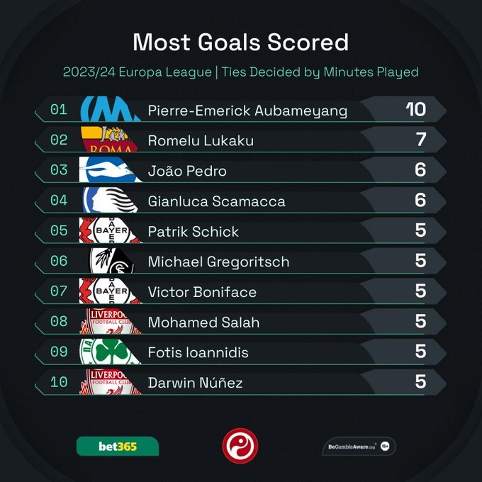 Ο Αντεμόλα Λούκμαν «έσπασε» το αήττητο 51 αγώνων της Λεβερκούζεν και με το δικό του χατ – τρικ χάρισε στην Αταλάντα το τρόπαιο του Europa League. Με τα τρία προσωπικά τέρματα έφτασε τα πέντε στη διοργάνωση και ισοφάρισε τους Ιωαννίδη, Μοχάμεντ Σαλάχ, Μπόνιφεϊς, Σικ και Σκαμάκα.