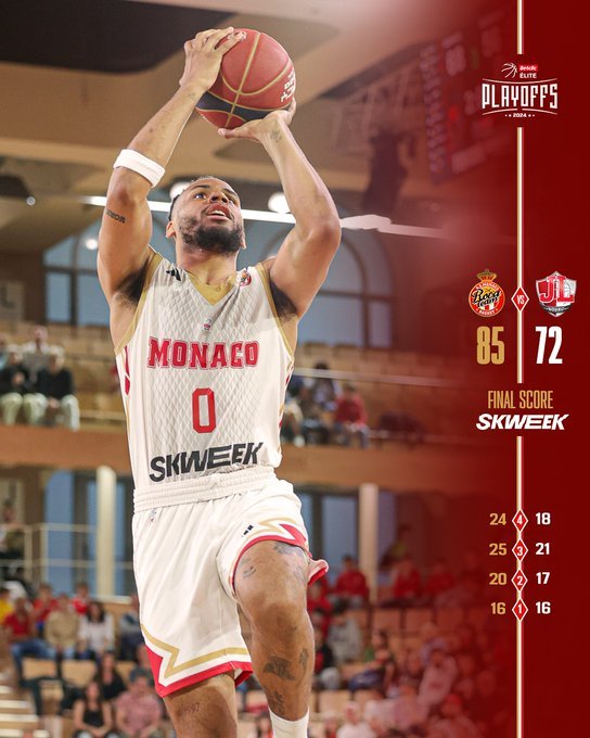 Επιτυχημένη πρεμιέρα για τη Μονακό στα ημιτελικά του πρωταθλήματος. Η ομάδα του Πριγκιπάτου δεν είχε τους Μάικ Τζέιμς, Τζον Μπράουν και Μαμ Ζαϊτέ, αλλά με κορυφαίο τον Έλι Οκόμπο έκαμψε την αντίσταση της Μπουργκ, επικρατώντας 85-72.