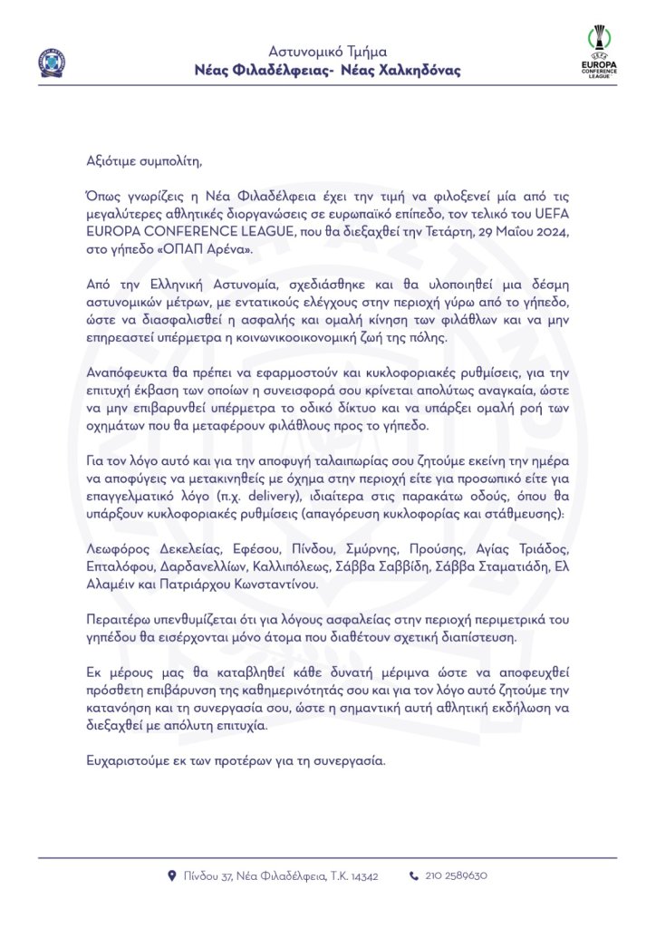 Ο τελικός του Conference στην Αγιά Σοφιά μεταξύ Ολυμπιακού και Φιορεντίνα πλησιάζει. Για το λόγο αυτό, ήδη από σήμερα οι αστυνομικοί του ΑΤ Νέας Φιλαδέλφειας – Νέας Χαλκηδόνας μοιράζουν στους πολίτες της περιοχής φυλλάδιο σε μια προσπάθεια να συνεισφέρουν και αυτοί με τη σειρά τους στην επιτυχή υλοποίηση των αστυνομικών μέτρων που έχουν σχεδιασθεί.