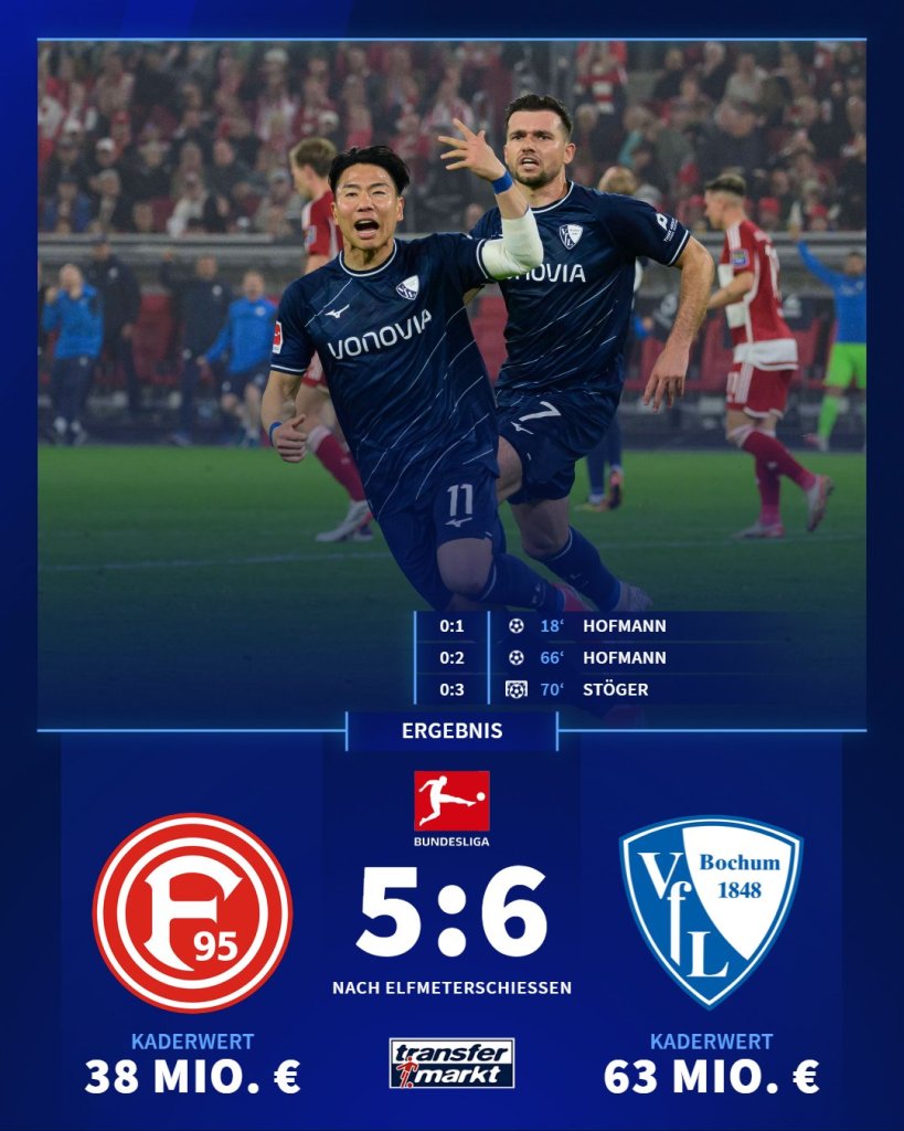 Εκεί οι δύο ομάδες έχασαν από ένα στη διαδικασία των πέντε χτυπημάτων. Έτσι ακολούθησε η νοκ-άουτ φάση. Ο Στέγκερ το έβαλε και ο Τζόλης απάντησε. Εύστοχοι και οι Σλότερμπεκ, Νιέμιεκ για το 5-5. Ο Βίτεκ σκόραρε για την Μπόχουμ αλλά ο Ουτσίμο αστόχησε και έτσι οι φιλοξενούμενοι θα αγωνίζονται και την επόμενη χρονιά στην Μπουντεσλίγκα.