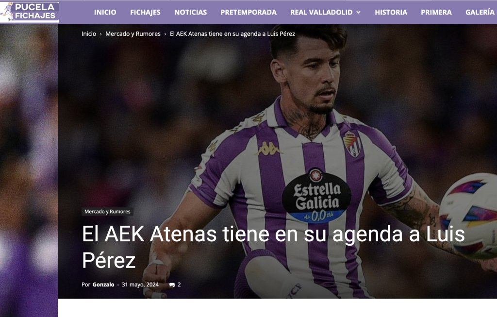 Την περίπτωση του Λουίς Πέρεθ έχει στην ατζέντα της η ΑΕΚ συμφωνα με δημοσίευμα της ιστοσελίδας pucelafichajes. Συγκεκριμένα, στο ρεπορτάζ των Ισπανών τονίζεται πως η Ενωση παρακολουθεί τον 29χρονο δεξιο μπακ της Βαγιαδολίδ ενώ καταγράφεται και το ενδιαφέρον που υπήρξε απο πλευράς κιτρινόαμυρων και κατά το παρελθόν.