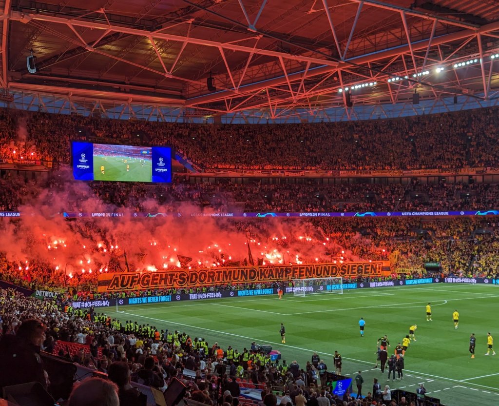 Μπορούσια Ντόρτμουντ και Ρεάλ Μαδρίτης κοντράρονται αυτήν την ώρα στο «Γουέμπλεϊ» στον μεγάλο τελικό του Champions League. Κατά τη διάρκεια του ημιχρόνου, οι οπαδοί των Βεστφαλών, έκαναν τη νύχτα...μέρα στο Λονδίνο, καθώς άναψαν εκατοντάδες καπνογόνα, δημιουργώντας μια απίθανη ατμόσφαιρα στο ιστορικό γήπεδο.