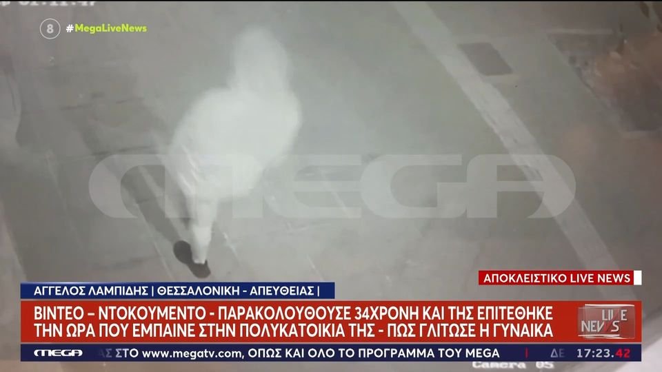 Το βίντεο δημοσίευσε το Mega. Η 33χρονη έζησε στιγμές τρόμου όταν άγνωστος την ακολούθησε στην πολυκατοικία που διαμένει και με χρήση σωματικής βίας, την έσυρε τραβώντας της τα ρούχα, επιχειρώντας να την βιάσει.