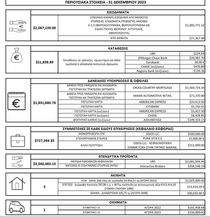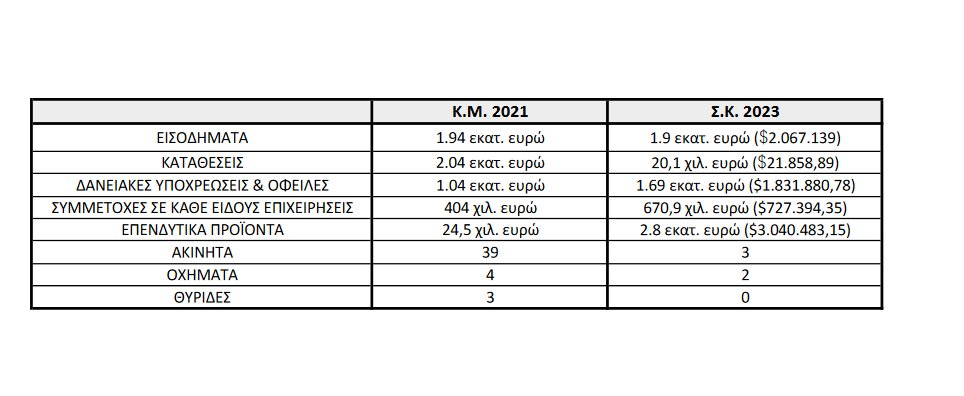 «Για αυτό λοιπόν, σας παρουσιάζω την περιουσιακή μου κατάσταση εδώ μπροστά σας, γιατί τελικά σε εσάς λογοδοτώ στον ελληνικό λαό. Βλέπετε πίσω μου τα στοιχεία για όλο το 2023», είπε.